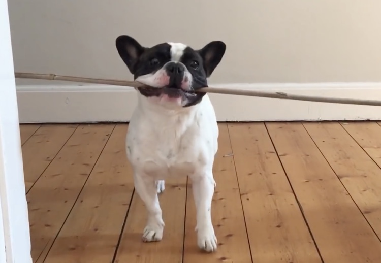 どうやら長い棒をゲットしたフレンチブルドッグのプッピー。 やったあ!遊ぶぞ〜!と、お部屋に持って帰ろうとするも... あれれ、なんでだろう通れないぞ... 試行錯誤するも、棒がつっかえて部屋に持って入ることができませんでした。 背中が悲しいぜ... -