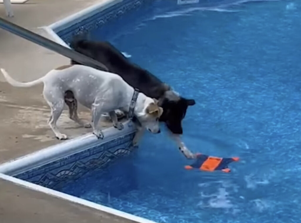 チームワーク悪すぎw プールに落ちたおもちゃを取りたい2匹の犬さんが…