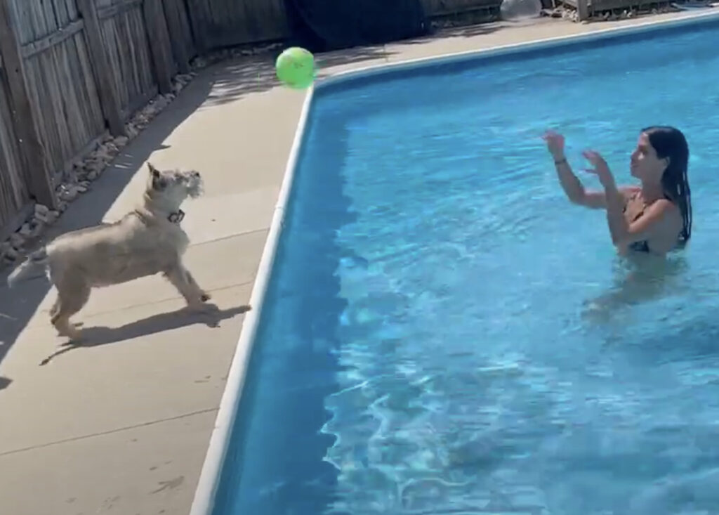 プールに入っている女性と その近くでウロウロしている犬さん。 本当は一緒にプールの中に入って 泳いで遊ぼうと考えていたそうですが、 犬さんが水泳よりもハマったのは 飼い主さんが投げてくれるボールを、 ポーンと鼻先で跳ね返す、 バレーのような遊び... -