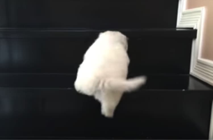一生懸命さにぎゅっとなる。階段をよじ登るマルチーズの子犬が…