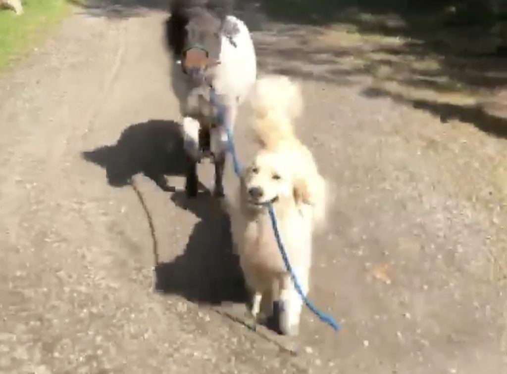 お散歩が大好きなゴールデンレトリバーさん。 自然が豊かな場所に住んでいて 広々とした林をいつもお散歩しています。 今日はお友達と一緒にお散歩! ミニチュアホースのトッパーさんです。 本当は飼い主さんが手綱を引いて お散歩しているんだけど、 この...