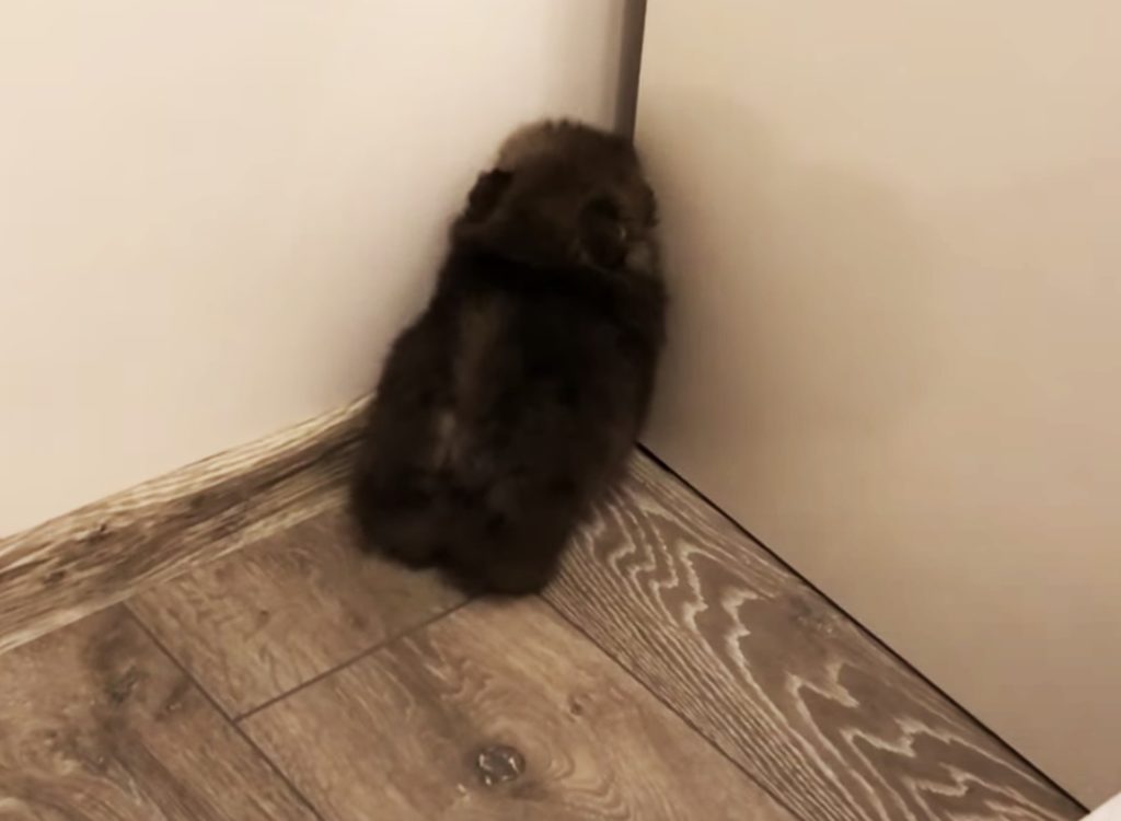 部屋の隅でモゾモゾしているのは もこもこしたポメラニアン子犬。 ほんのちょっとだけ隙間が開いている 戸棚が気になっているみたいです。 前足を使って開けたいのかな? ...と思って見ていたら、なんと! そのまま頭をぐいぐいと押し込んで、 隙間の中へ... -