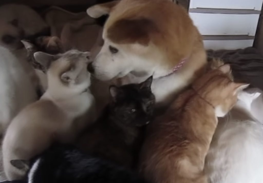 犬「なんでみんな僕の周りに…?」猫に囲まれてモテモテの犬さん。