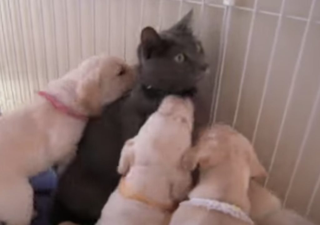 ゴールデンレトリバーの子犬たちが集まって、 何やら騒がしいぞ? その中心にいるのは、1匹の猫さん。 子犬たちはみんなで猫さんを囲んで、 腕を回して抱きついたり、ペロペロと毛づくろい。 たくさんの子犬がいるから、 次から次へと子犬がやってきては... -