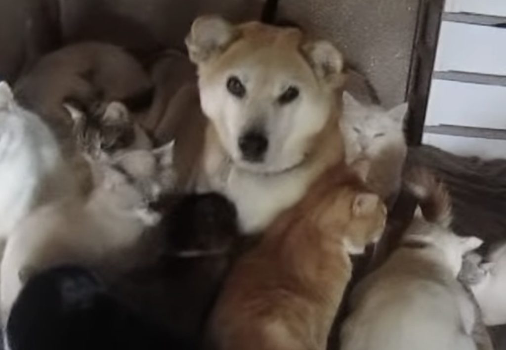 ワンコのそばが一番あったかい?猫に囲まれて困惑する犬。