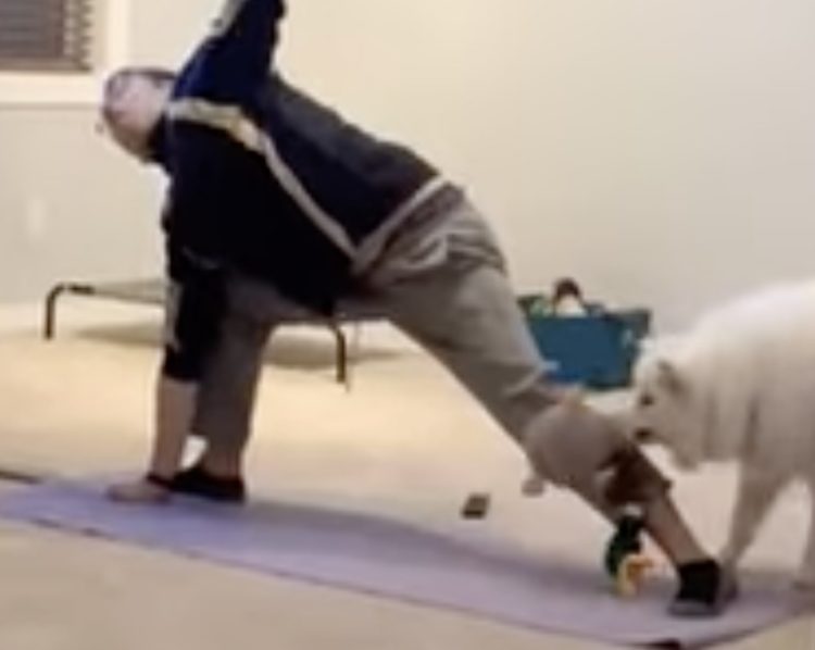 ヨガの最中なのに…飼い主のお尻をバシバシ叩くワンコ。