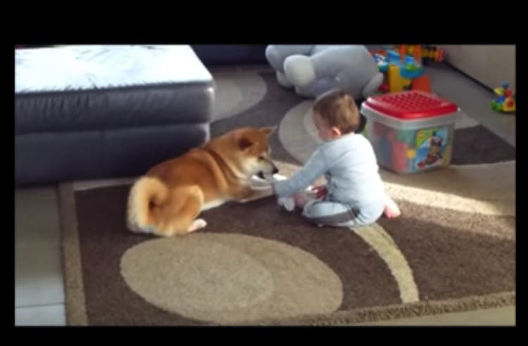 ほんとうの兄弟みたい?赤ちゃんと遊ぶ柴犬。