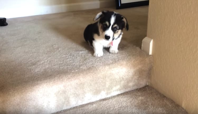 上目遣いにノックアウト!コーギー子犬、初めての階段。