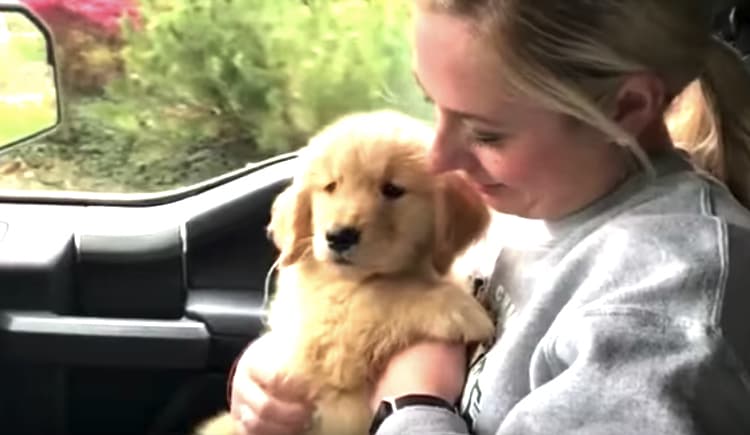 「ううん、大丈夫かなぁ…?」ゴールデン子犬初めてのドライブ。