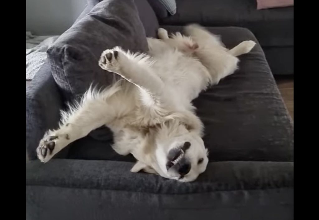 1歳になるゴールデンレトリバーのネッサちゃん。 いつもリビングのソファで横になって そのまま眠りについているようなのですが 飼い主さんが朝の挨拶に行くと、 毎日面白い姿で挨拶をしてくれるのです。 何故か仰向けになってバンザーイ♪ 飼い主さんを逆... -