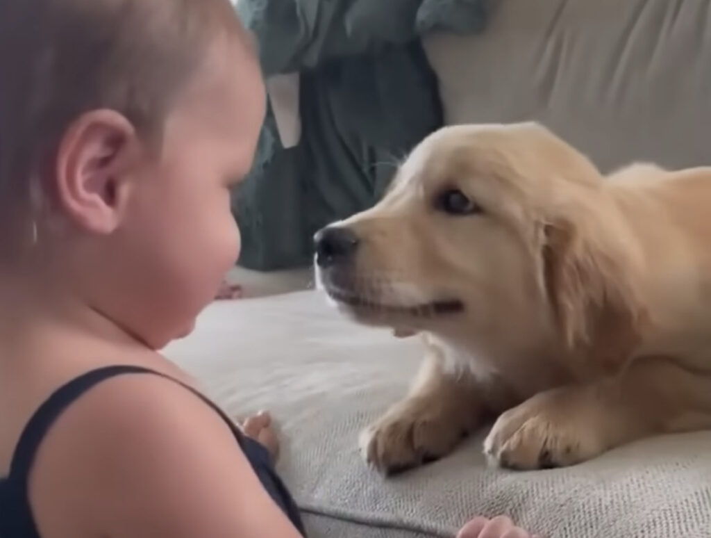 ゴールデンレトリバーの赤ちゃんと つかまり立ちできるようになったばかりの 女の子の赤ちゃん。 子犬さんの可愛らしさに メロメロになったのは 大人だけじゃなかったようで♪ 女の子がハニカミながら 子犬さんの鼻先にキス♡ 子犬さんの方も首を伸ばして、 ... -