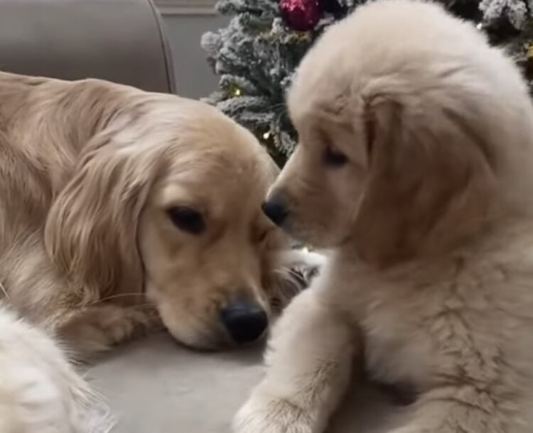 お昼寝したくて横になっている ゴールデンレトリバーのお兄ちゃんと、 まだまだ起きて遊びたい子犬さん。 お兄ちゃん犬が寝ようとしても 子犬さんが尻尾に飛びかかったりと なかなか寝かせてくれません。 小さい子は、元気が有り余ってる!! とーっても自... -