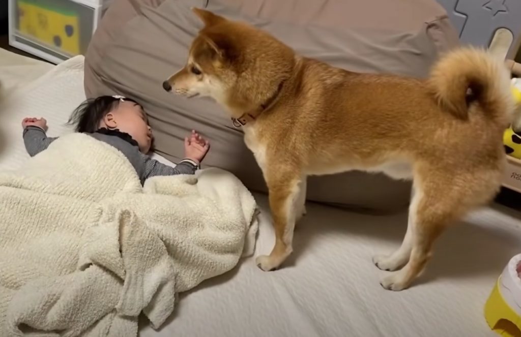 「遊びたかったな〜」赤ちゃんが寝ていると寂しそうな柴犬。