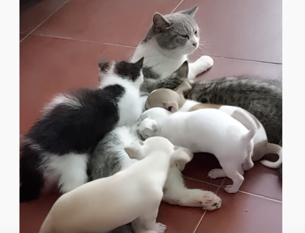 子犬がミルクを貰っているのは…猫!? それには優しい理由があって…