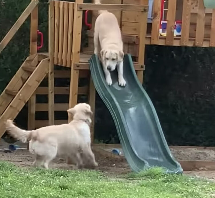 滑り台が降りられない兄犬と応援する妹犬。2匹のやりとりが可愛い♪