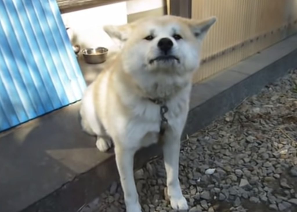 一応、威嚇しておくか…面倒くさそうに番犬をする秋田犬。