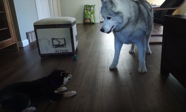 どきどきの初対面の瞬間! 仲良くなれるかな? 少しずつ近くハスキーさん 全然大きさの違う二人の反応は… たくさん遊んで、眠ってしまったワンコさん これから毎日あそべるね!