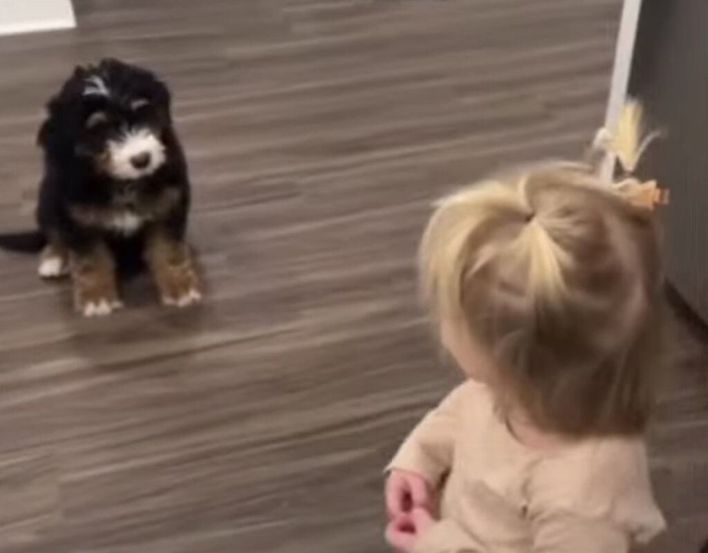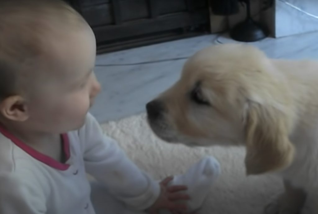 「怖いワン…」「誰…?」 初めて対面した赤ちゃんと子犬、でも仲良くなるのは一瞬で!