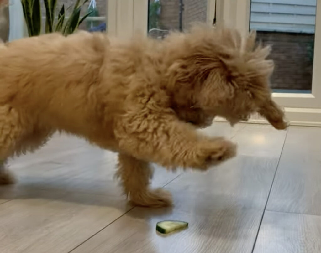 「こいつめっ!」きゅうりと戦うぬいぐるみのような子犬、動きが可愛すぎ♪