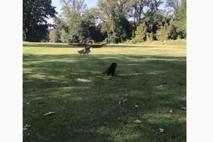 危機一髪!よーく見ると、お散歩中の犬をめがけて猛禽類が。