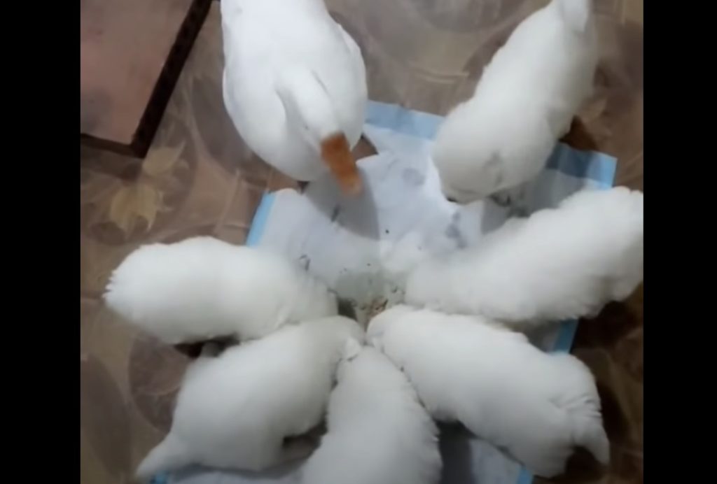 完全に犬家族の一員になってる!白い子犬と遊びたいアヒルさん。