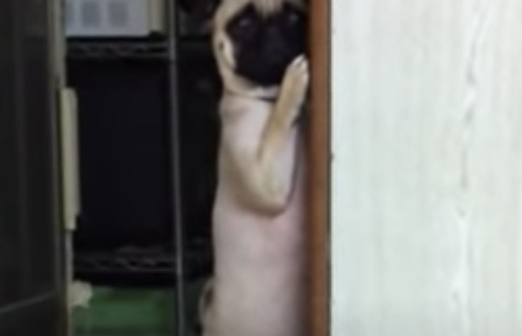 ソーセージを勝手に食べて、 怒られちゃったパグ犬さん。 それを知った飼い主さんは大激怒! 大きな声で犬さんを叱ります。 あぁ、これはまずい... もうしばらく許してもらえないかも。 怒りを察知したパグ犬さんは、 そーっと壁の後ろに隠れて 「まだ怒っ... -
