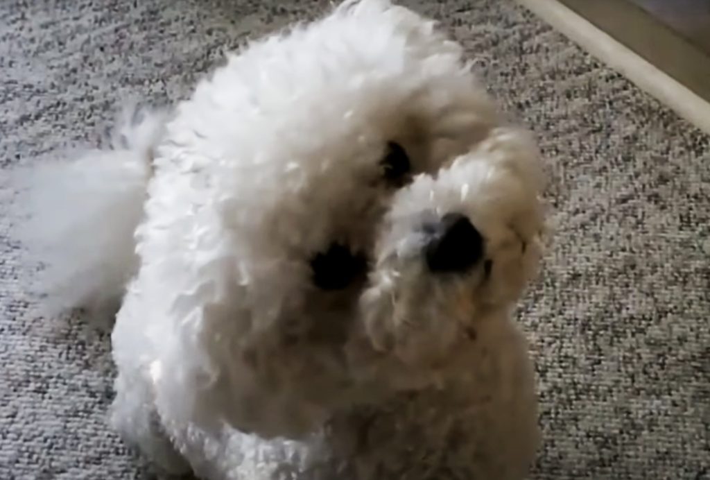むむ?なんの音?口笛に反応して、首をかしげるビション・フリーゼ