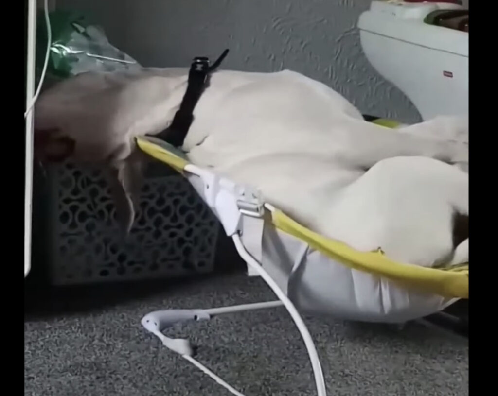 電車で眠っている人みたい。。。赤ちゃんのベッドを借りて爆睡する犬。
