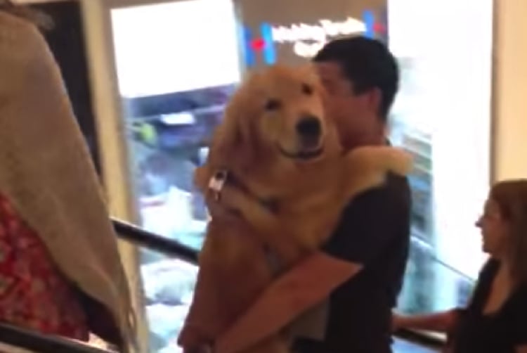 大きくても心は赤ちゃん!抱っこでエスカレーターに乗る犬。