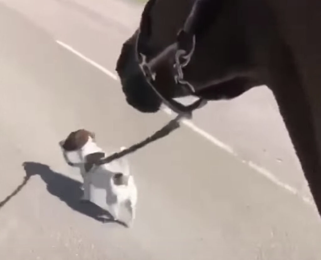 ちゃんとついてきてね〜♪ 楽しそうに馬さんとお散歩する犬。