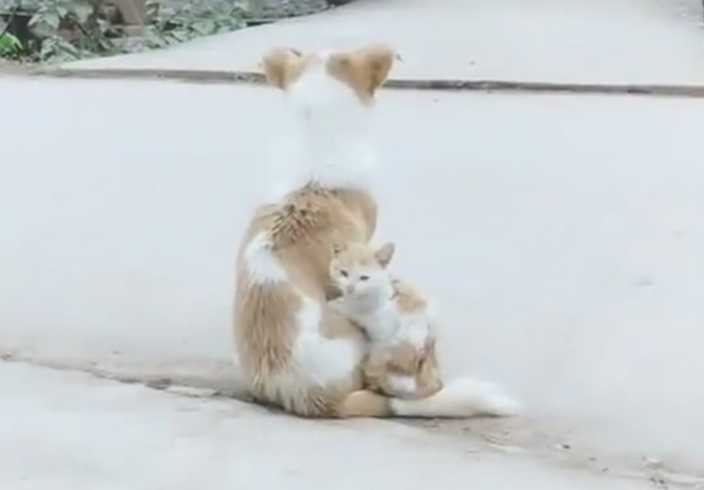 同じ母犬から生まれた兄弟だと、 毛色や柄が似ているのはよくある事ですが、 兄弟でもない、しかも種族も違う動物同士で ここまでそっくりなのは珍しいかも! 背中をむけている犬さんに、 ピッタリと寄り添っているのは 小さな子猫ちゃん。 白と茶の毛が犬...