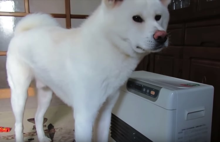 怖いけどちょっと味見?初めてのヒーターに興味津々な秋田犬。