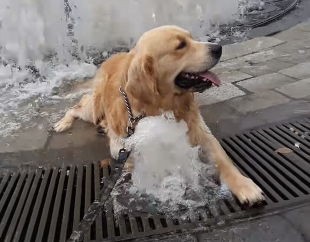 お尻が危ない〜!噴水口に座っちゃった犬。この後…
