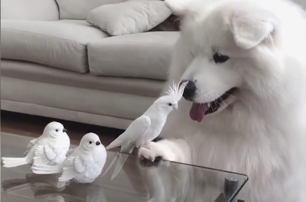 真っ白モフモフの毛並みの犬、ベラちゃん。 片手をちょいっとテーブルに乗せて、ずーっと何かに耐えています。 その手の上には、インコさんが! 「えーっと、どうしよう...動けない」と困った表情。 腕をプルプルさせながらも動かないように我慢ガマン。 ...