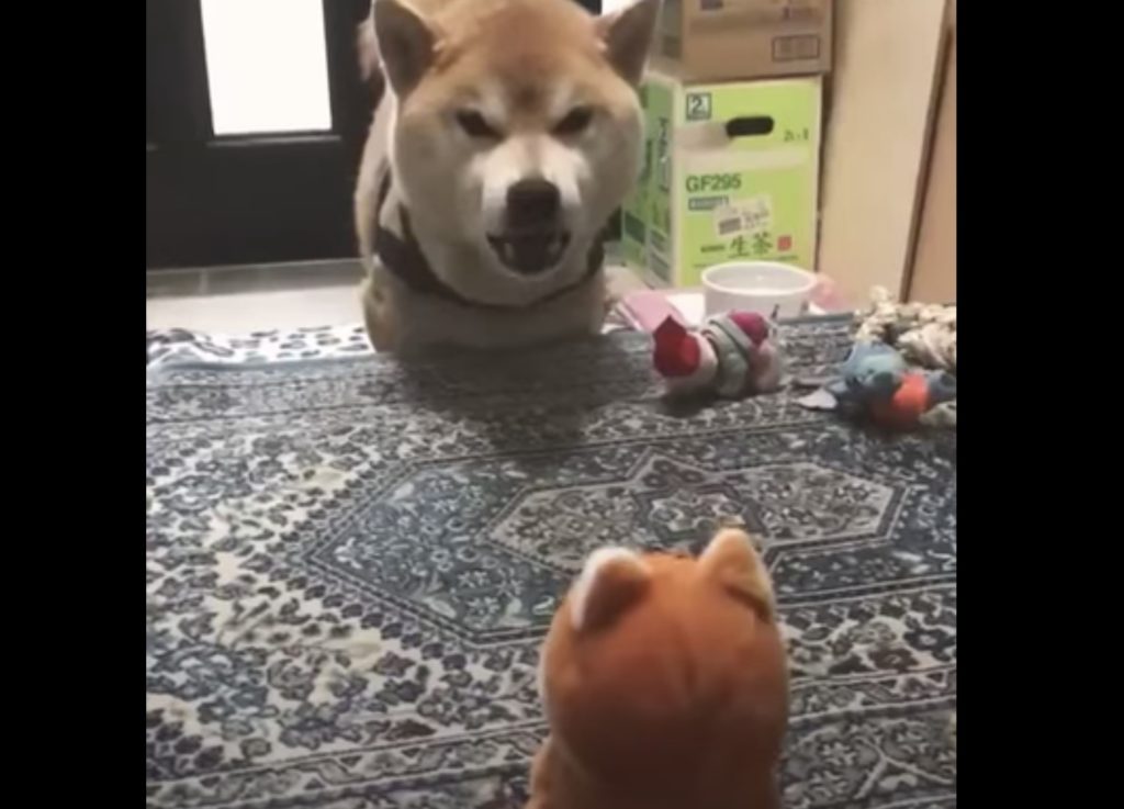変な声が返ってくるー!鳴き声をマネするぬいぐるみに柴犬が…