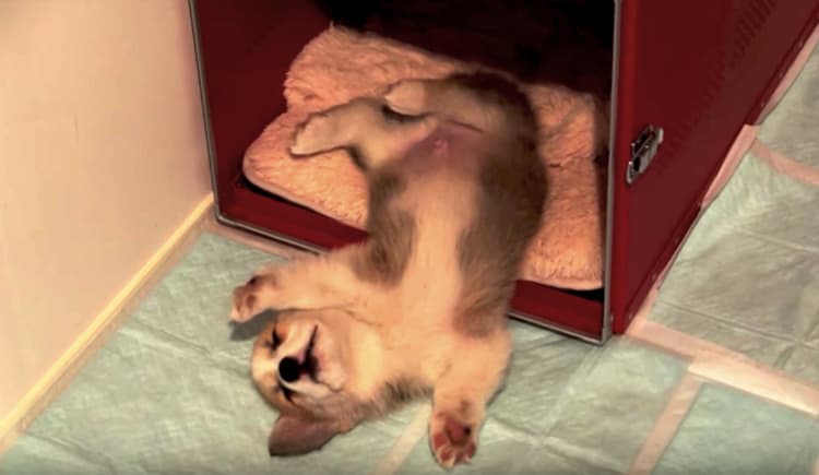 バンザ〜イ! 爆睡するコーギー子犬の寝相が可愛すぎ。