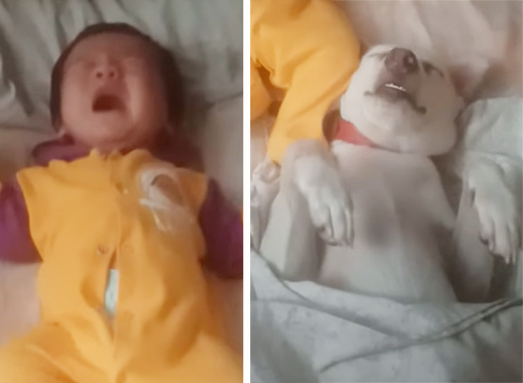 その状態でも眠れるってすごい! 赤ちゃんに蹴られても泣かれても起きない犬。
