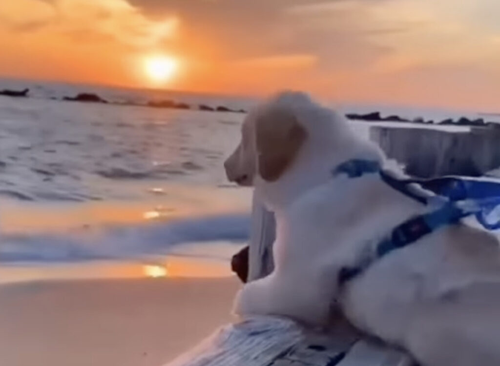 飼い主さんとお散歩している犬さん。 海岸沿いをお散歩していると 海の向こうに綺麗な夕日が♪ 飼い主さんが立ち止まって見ていると 犬さんも同じように夕日に興味を持って、 「綺麗だね〜♪」と 身を乗り出して夕日を眺めるではありませんか♪ 波の音を聞き...