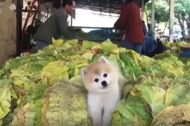 キャベツの妖精かと思った!可愛いワンコがキャベツの上で癒しをふりまいてた。