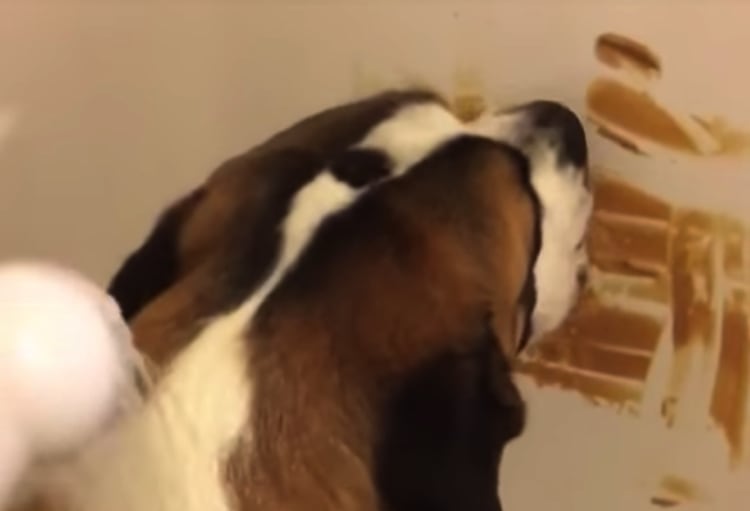 お風呂嫌いなワンコを入れるのはものすごく大変。 何かいい方法はないのか… と思ったらこんな方法が! 壁におやつを塗りたくり、夢中で舐めている間に 洗ってしまおうという大胆すぎる方法(笑) でも効果は抜群? 大人しく洗われるワンコさんなのでした... -