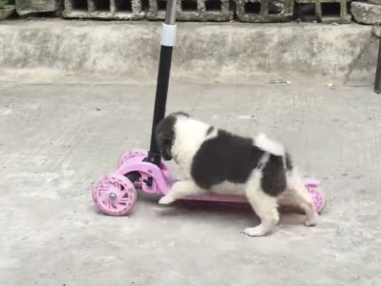 できるかな?ひとりでキックボードに乗る練習をする子犬。