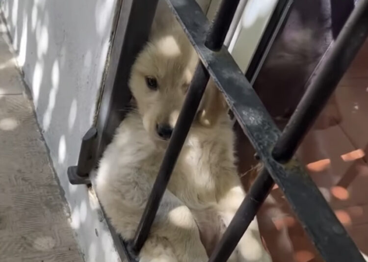 子犬「なんで僕だけ…?」 1匹だけペットドアを通れなくてジタバタ!