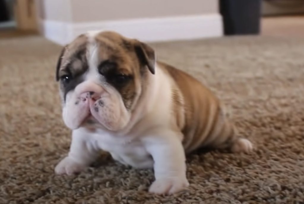 ヨチヨチ、トコトコ初めて歩けるようになったブルドッグ子犬。
