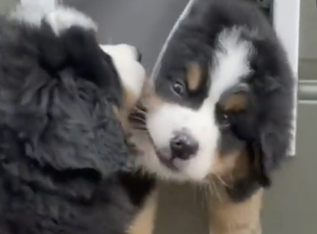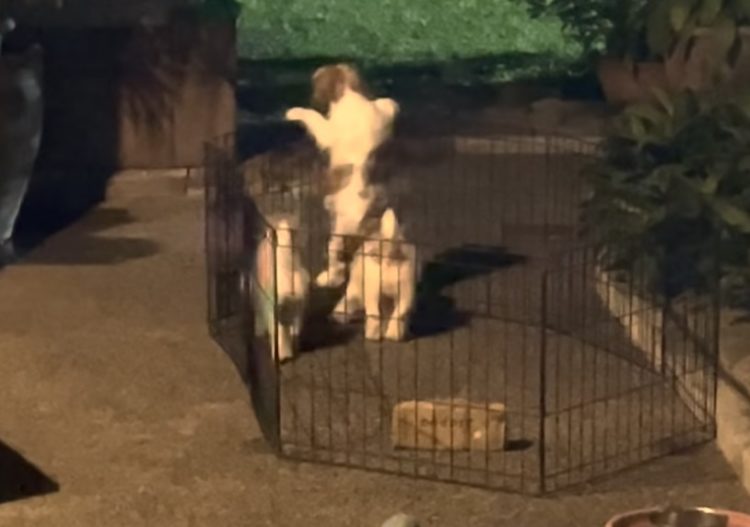 子犬「なんで僕だけ…?」 1匹だけペットドアを通れなくてジタバタ!