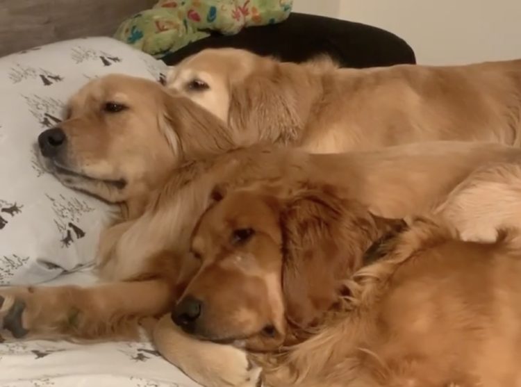 ちょっと狭いけど満足なのだ♪川の字で寝るゴールデンレトリバーたち