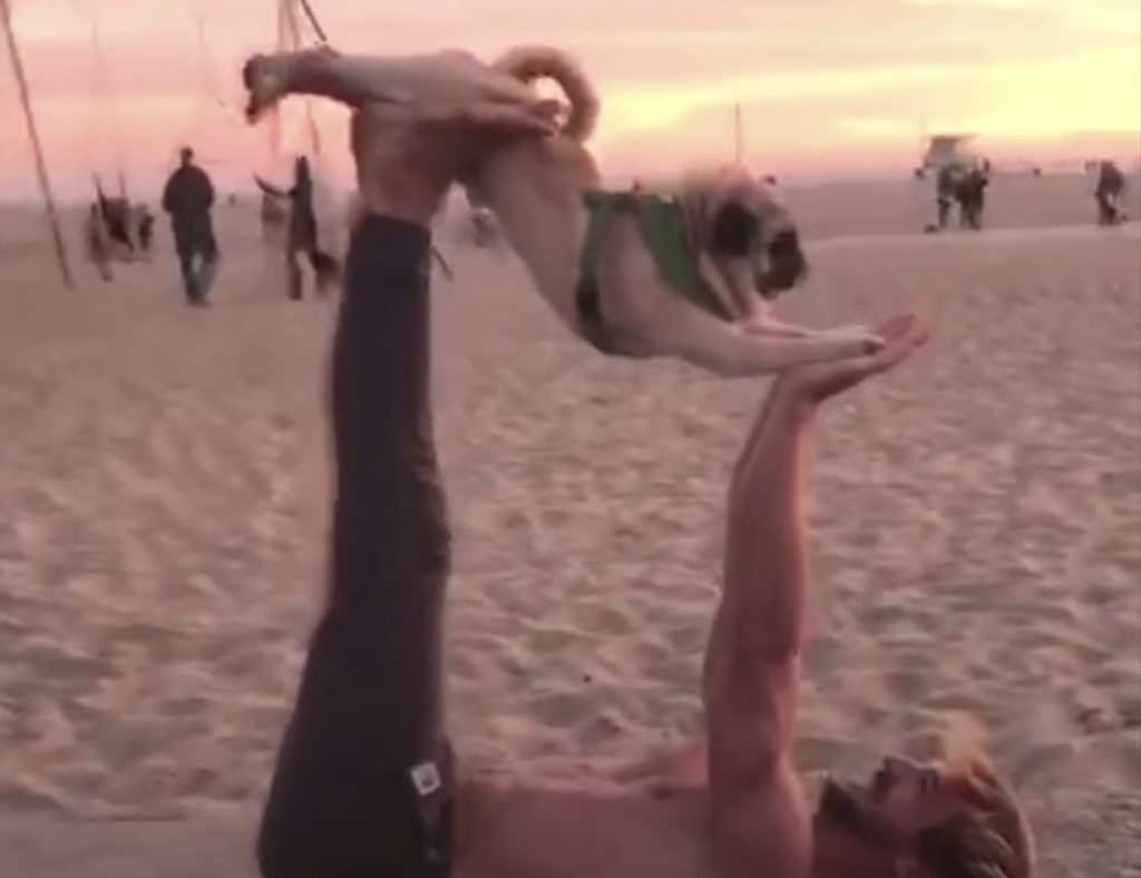 夕暮れ時のビーチで、観光客が集まって 何かに注目していました。そこにいたのは 飼い主の男性と一緒に 華麗にヨガのポーズを決めている 手足の小さなパグさん! これは小型犬だからこそ出来るポーズでしょうか。 しっかりと飼い主さんと手を合わせて 両足... -