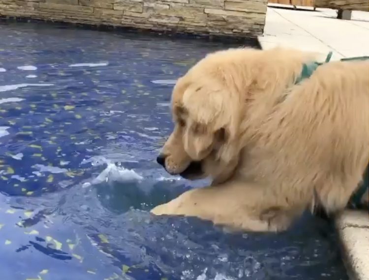 ゴールデンレトリバーの子犬さん。 まだまだプールに慣れていなくって 泳げるけれど、飛び込むのは怖いんだ! 「ちゃんと足がつく深さだよね?」 「水、冷たくないよね?」と 何度も何度も水を触って確認中。 まずは、足に水をかけて水温に慣れてと... あ... -