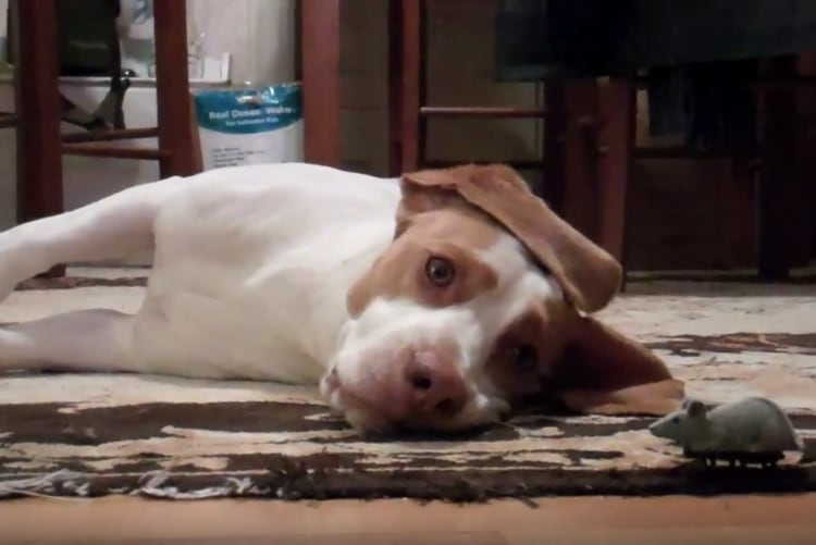ぼーっと横になっているワンコさん ネズミのおもちゃにもあんまり興味なし… と思いきや、 !!!!? 急にテンションマックスになるワンコさん。 身悶えしながら遊びまくり、ネズミが動かなくなると …。 心配になるリアクションなのでした。 -
