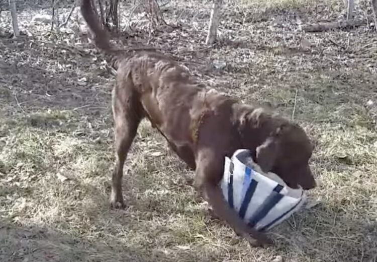 去勢手術後のワンコ、エリザベスカラーに八つ当たり。