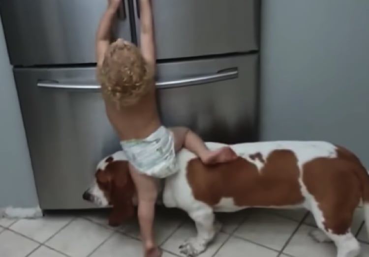 冷蔵庫の中身をみたいあかちゃん でも届かない…と思ったら、ワンコが手助け! ゲットしたものは二人で分け合うのかな? 見事な協力プレイで冷蔵庫を開けることに成功! とてもかわいいふたりなのでした。